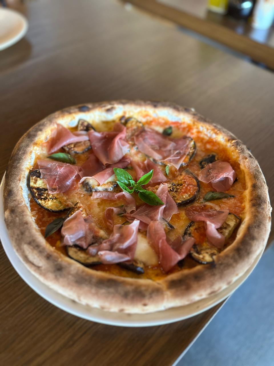 salsa tomate, queso scamorza, berenjena, queso parmesano, jamon serrano, albahaca